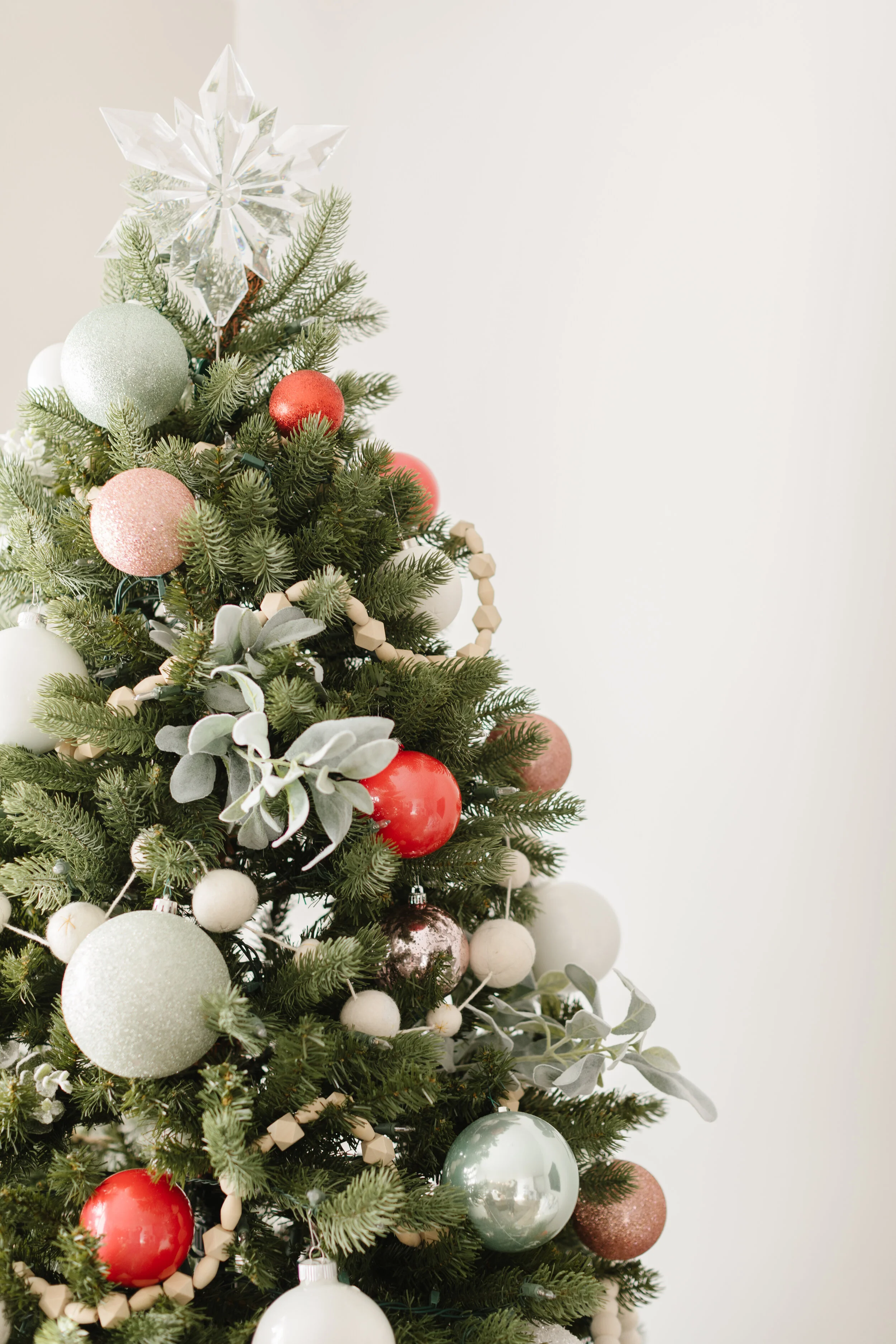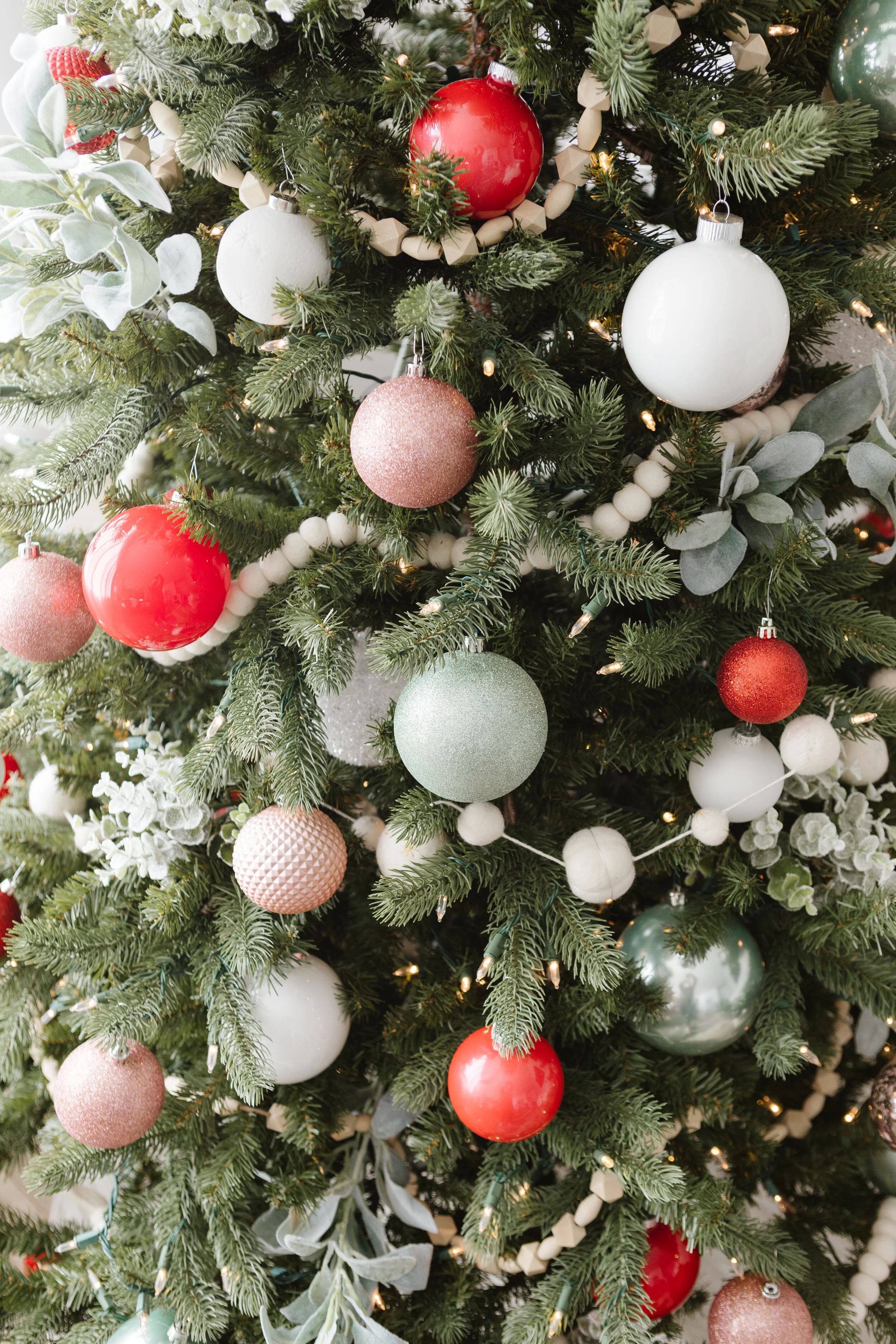 3. USE ONE TYPE OF ORNAMENT. This sounds so boring! But I love the overall effect. I used the classic Christmas ball (globe? sphere?) in four different colors: pink, red, white & mint. And then a couple different sizes in each color. The mint and pink ornaments are Hobby Lobby. The bigger red & white ones I made from a paint shaking DIY tutorial from Aubry @ Hello Maypole.